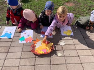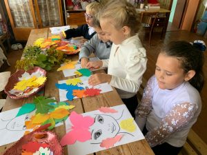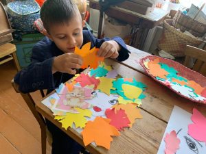 Для работы мы использовали напечатанные основы, к которым дети по своему вкусу подбирали листья и форму причёски. В результате у каждого воспитанника получился свой неповторимый яркий образ.